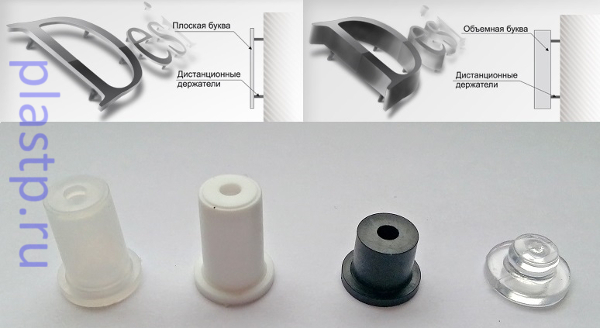 Дистанционные держатели состоят из двух элементов — стаканчика и грибка (защелкивающейся кнопки) — и служат для крепления плоских и объёмных букв, вывесок и табличек на удалении от стены.