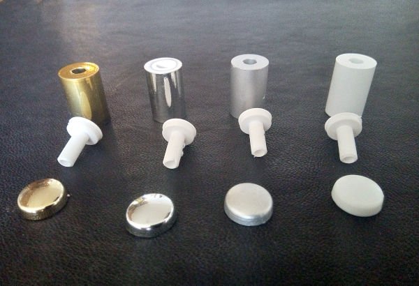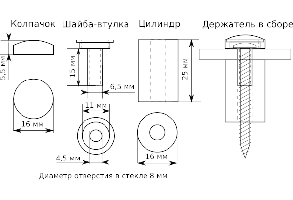 Дистанционный держатель состоит из трех частей: колпачка, втулки и цилиндра. Цилиндр обеспечивает удаление от стены, втулка защищает закрепляемые предметы (зеркала, стекла, таблички) от самореза, колпачок оформляет внешний вид крепления.